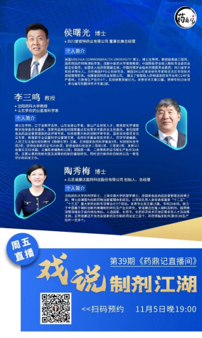 对于高端复杂制剂的研发难点和要点以及不同制剂的市场现状,2021年11月5日晚,普锐特药业董事长兼总经理侯曙光博士、沈阳药科大学教授兼罗欣药业首席科学家李三鸣老师和诺康达医药总经理陶秀梅博士做客药鼎记直播间,给大家讲述了他们与药物制剂之间的经历与故事,同时也为各位目前对此存在问题的行业人士答疑解惑。