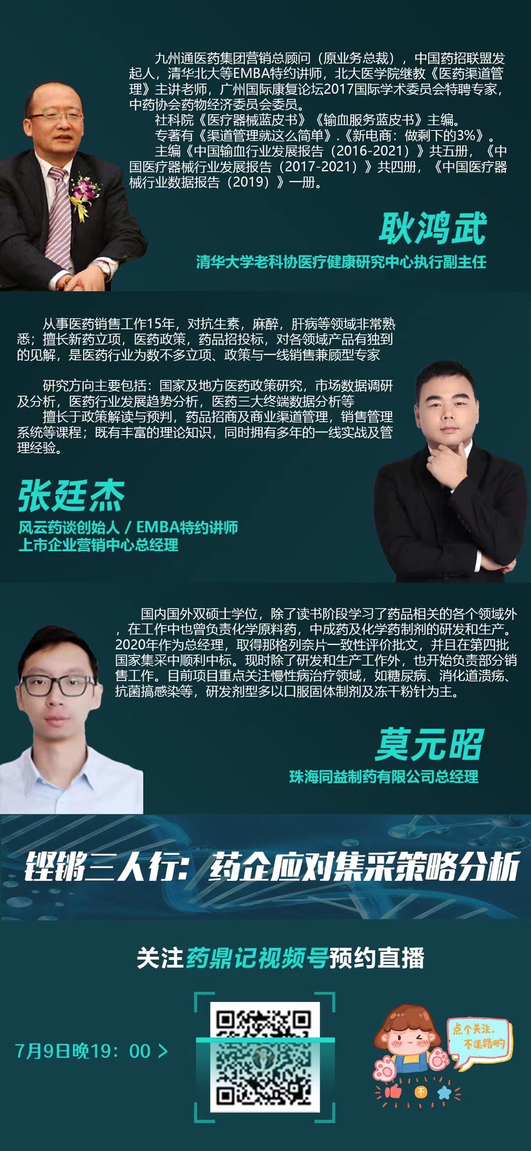 中国的带量集中采购是药企打开进入医院销售渠道的一种最直接方式,有人认为这是火焰是冰山,也有人认为这是一个重大的机会。7月9日晚直播请到了3位对集采各有看法的嘉宾:此次直播三位嘉宾分别从政策制定、往期集采数据分析及企业自身招投标策略等不同角度出发,深入探讨了前几批国采出现的一些现象和问题。