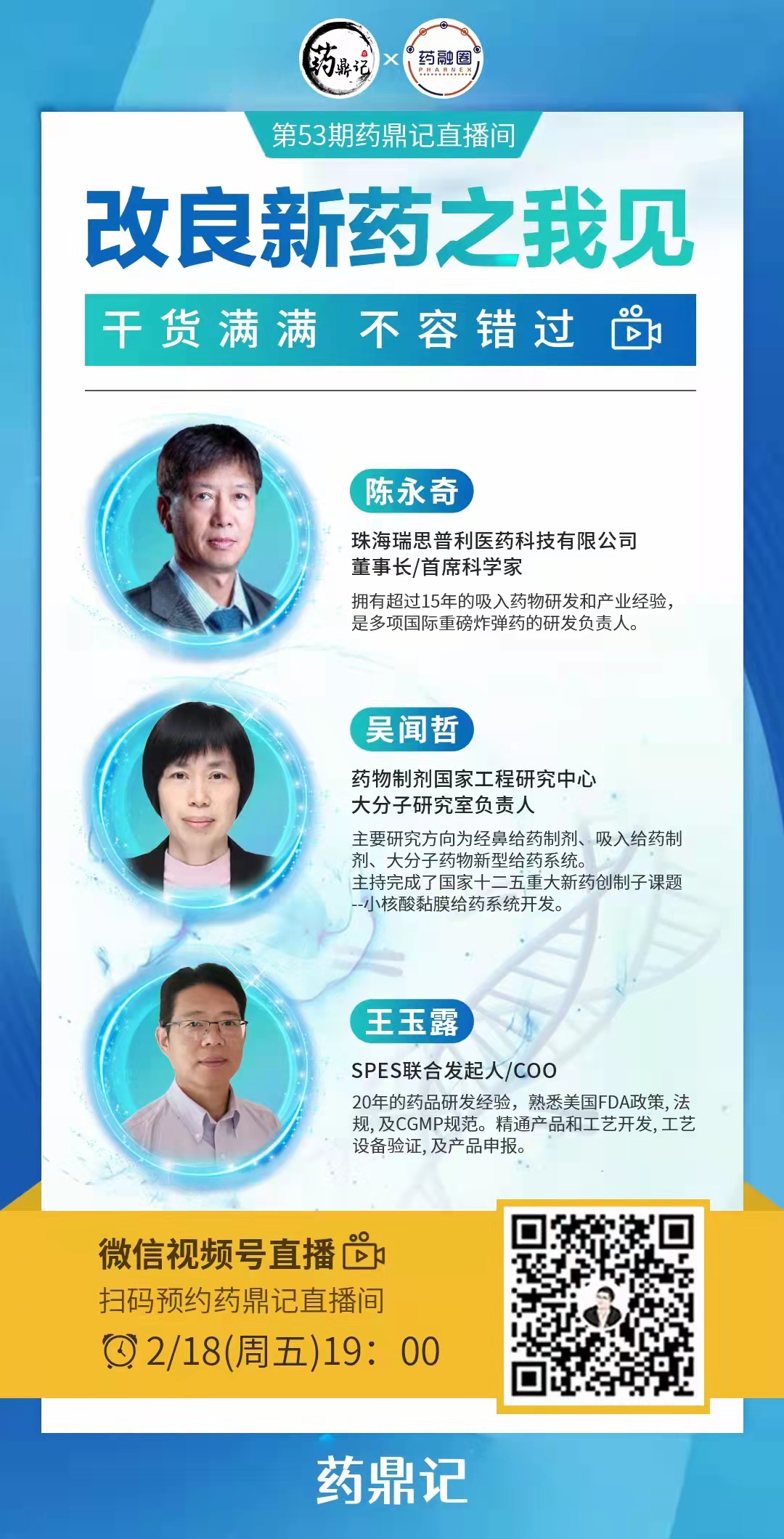 2022年2月18日周五晚19:00,药鼎记直播间邀请了陈永奇、吴闻哲、王玉露三位嘉宾,一起探讨对改良新药的见解,干货慢慢,不容错过!