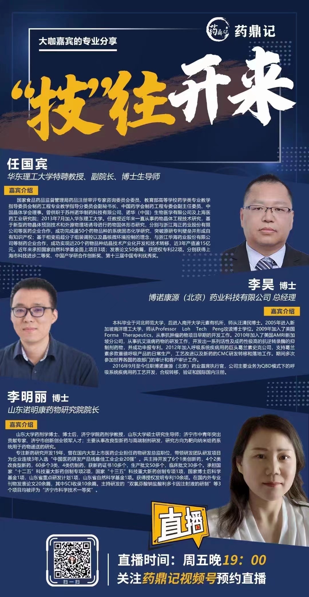 为了给更多医药人带来有关改良药、晶型以及原料药问题的解答与探讨,2021年8月6日晚,药鼎记视频号直播隆重邀请了三位嘉宾,覆盖晶体、缓控释、复杂注射剂等技术全方面的详尽知识和要点,真正让所有参与直播的医药人实现在家通过直播就可以与大拿面对面,一同挖掘行业全新的合作机会和发展方向。