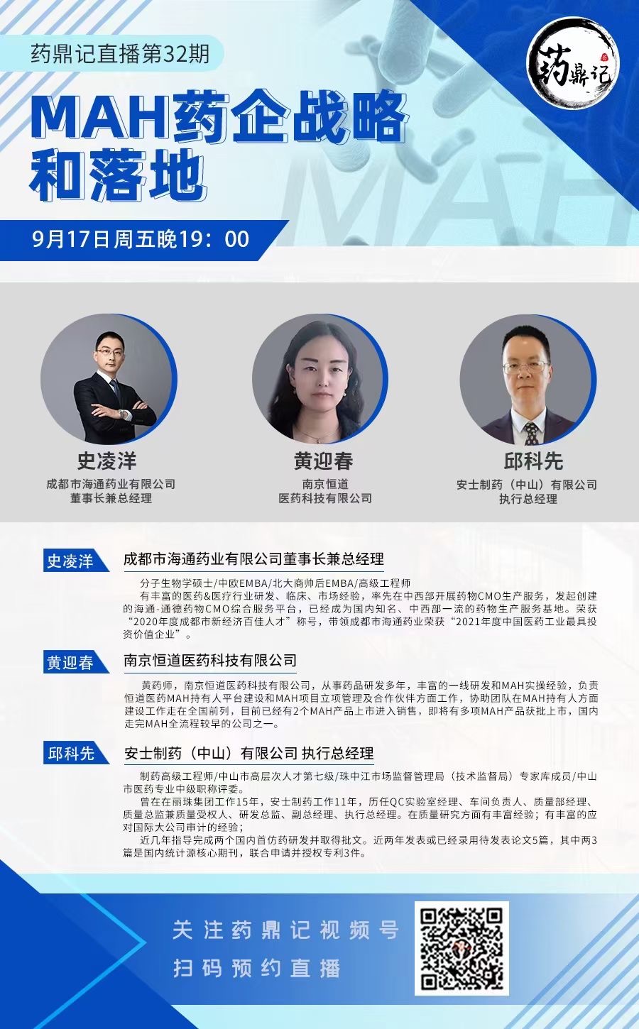 MAH从2016年开始试点,5年间落地开花,成果卓然,但也暴露了一些问题。例如委托生产风险、民事赔偿责任、落地策略、药物警戒制度等。企业如何转型做MAH持有人,如何在接下来的MAH持续推进中共享政策和时代的红利?怀着这些疑惑,我们由此展开此次直播,通过三位大拿的分享,给大家揭开MAH战略和实操一幕。