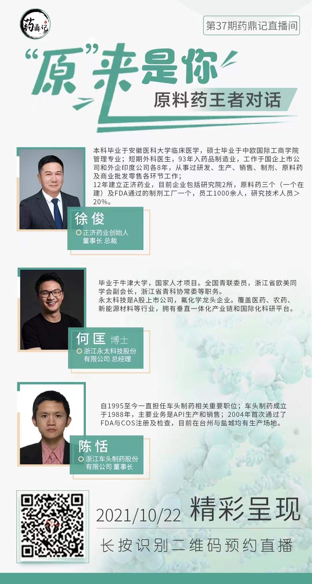 医药市场不断扩大,原料药优势地位逐渐凸显,众多原料药企业想要借助此时机转型升级并进一步开拓国内外市场,但却面各种各样的问题。针对这些问题,药鼎记视频号于10月22日晚开展直播——‘原’来是你,邀请3位原料药企业掌门人参与此次研讨,以原料药转型升级视角俯瞰全产业链的发展。