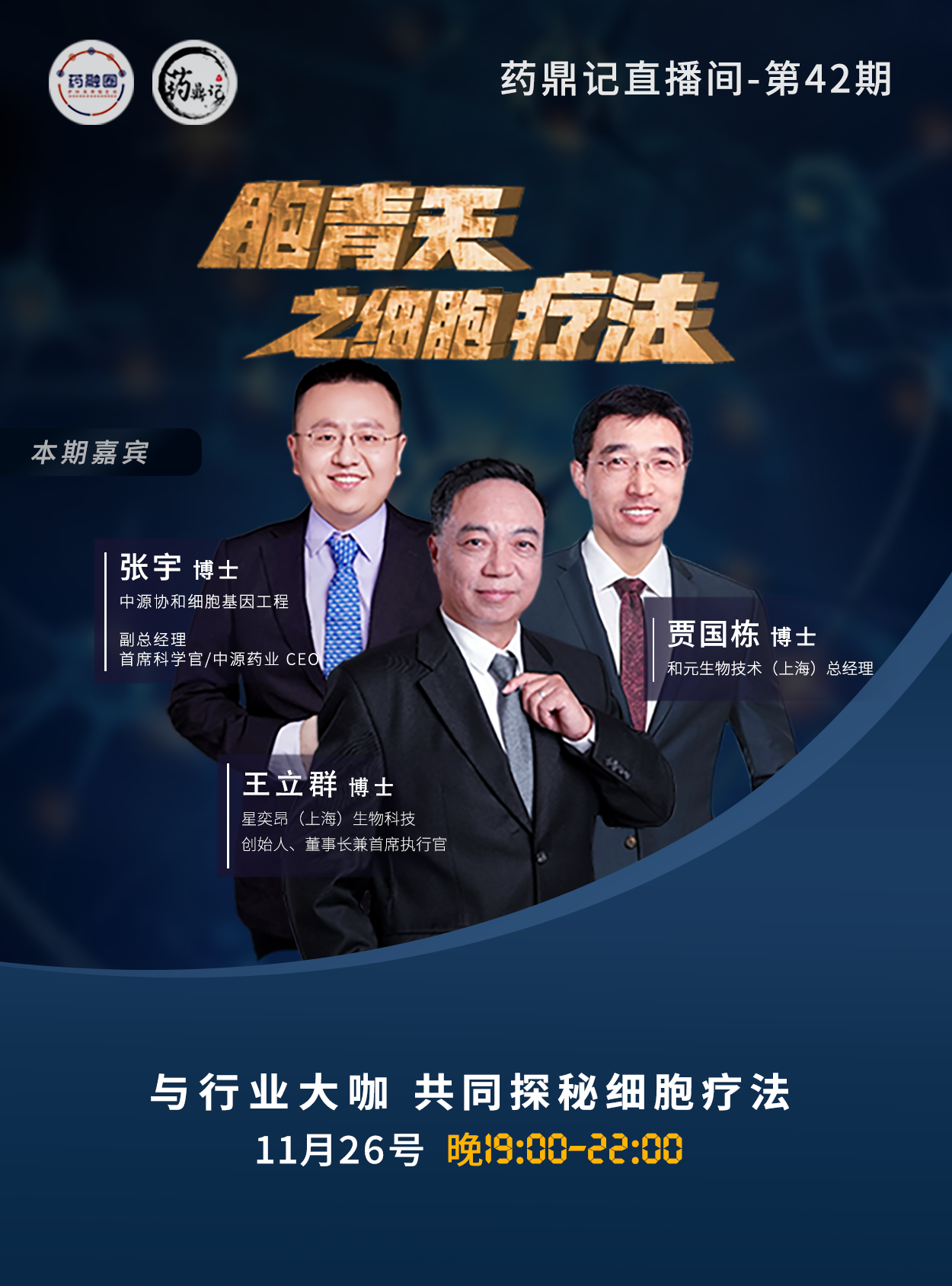 细胞疗法现在正处于最好的发展时期,细胞疗法作为第三代医疗手段,不论是利用自身细胞抗癌的“过继性免疫细胞治疗”,还是万能的“干细胞疗法”,都展现出巨大的前景。2021年11月19日晚,直播中我们重温经典武侠,与数位英雄进行专业交流。生物医药江湖风起云涌,更有投融资机构巾帼们鼎力相助。