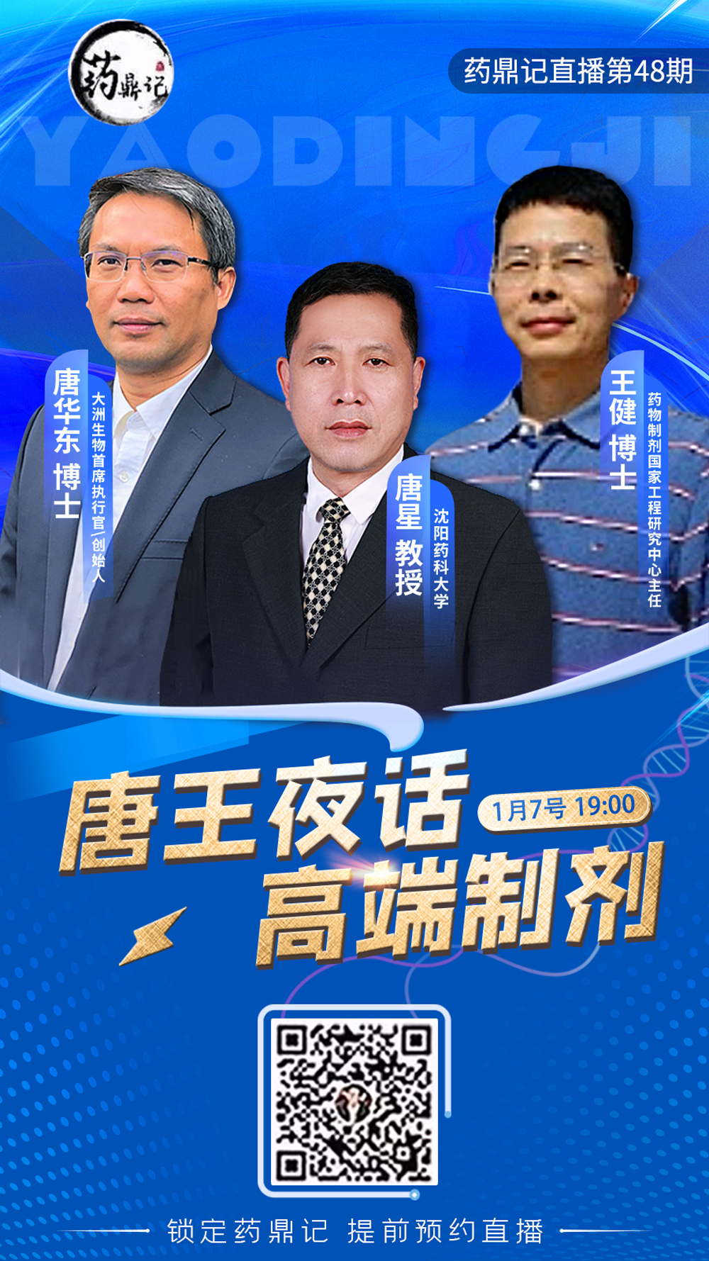 2022年1月7日晚17:00,锁定药鼎记直播间,听唐华东博士、唐星教授、王健博士谈谈高端制剂那些事儿。