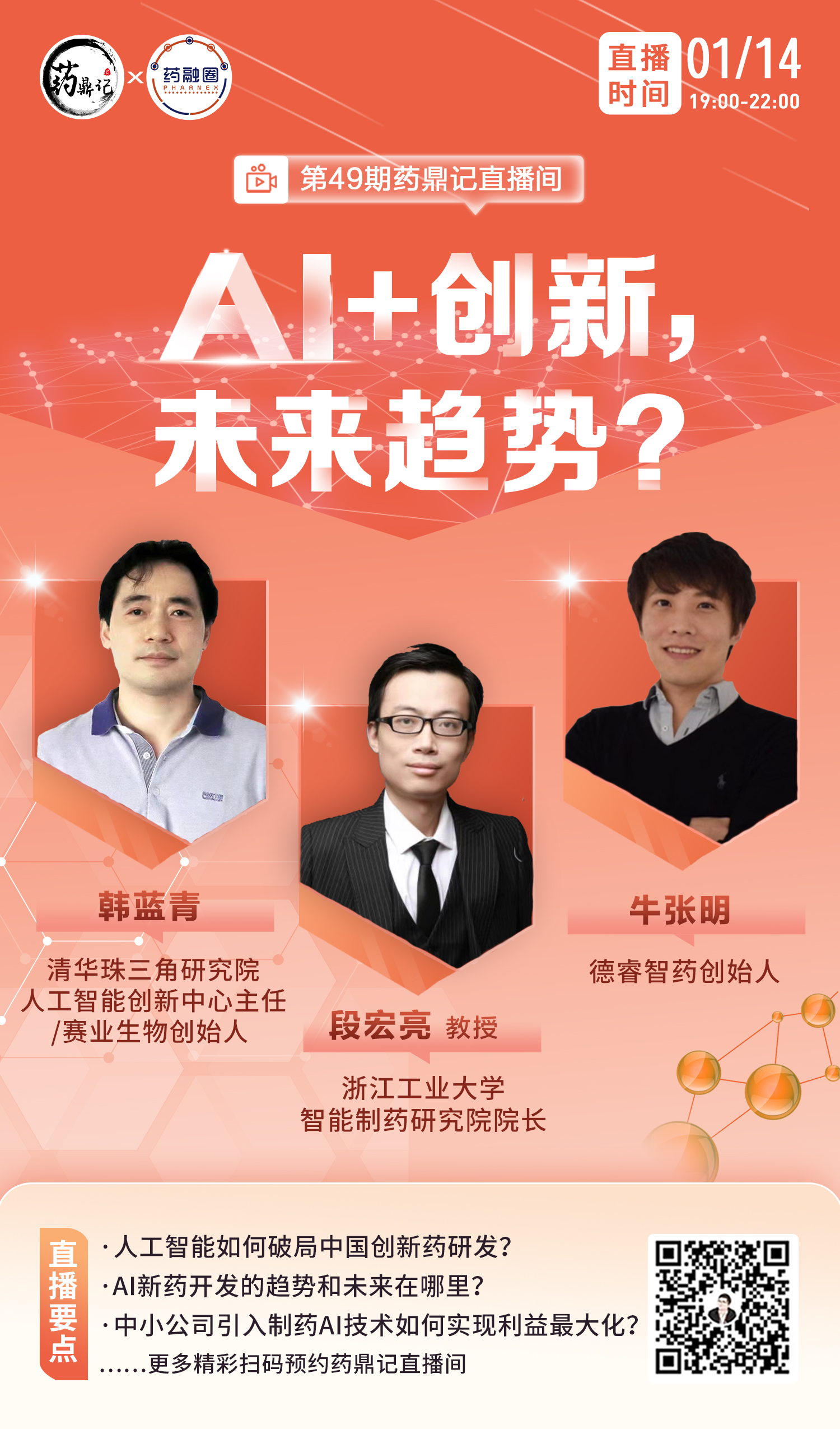 2022年1月14日周五晚19:00—22:00,药鼎记直播间邀请了三位大咖:韩蓝青、段宏亮、牛张明,一起探讨“AI+创新,未来趋势”,直播内容包括人工智能如何让突破中国创新药研发?AI新药开发的趋势和未来在哪里?中小公司引入制药AI技术如何让实现利益最大化?......更多精彩尽在直播间