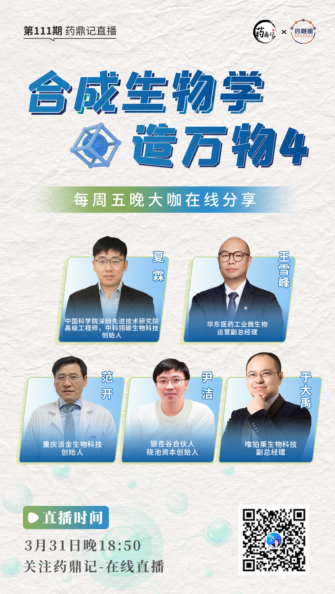 “合成生物学”至今已有100多年历史。目前合成生物技术应用在医药、化学品、生物材料、生物能源、农业、食品等多个领域。其中,对医药领域可探索的空间最为宽广。3月31日晚19点,“药鼎记”邀请了多位嘉宾为大家带来“合成生物学”相关知识分享。